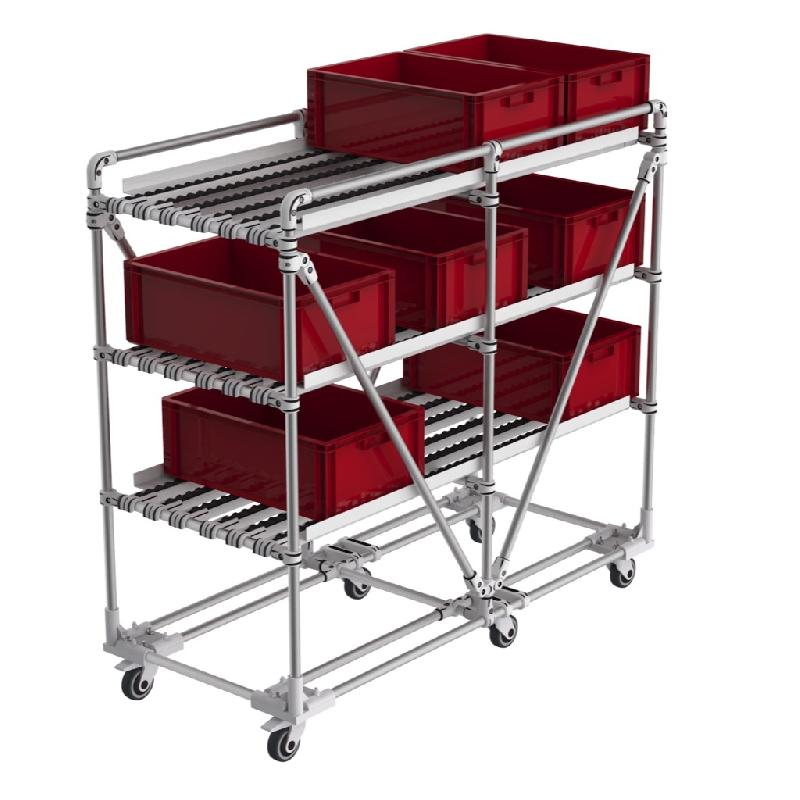 Convoyeur modulaire et évolutif en V. 2 niveaux. Réglable en hauteur. Structure tubulaire robuste et ajustable. Niveaux réglables en inclinaison et hauteur au sol. Structure en aluminium légère et resistante. Montage sur roulettes - Référence : 23 - 4 - Marque : Trilogiq
