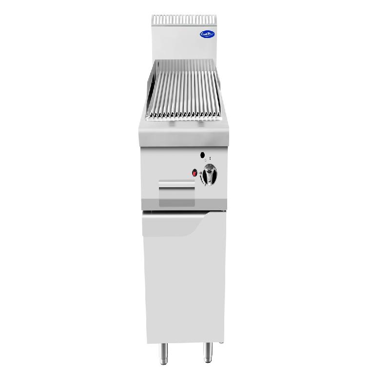 - Structure en inox - Bords relevés - Plaque rainurée en fonte relevable - Pierres volcaniques incluses - 1 brûleur et 1 contrôleur - Bac récupérateur de graisse - Monté en gaz naturel (injecteur B/P en option) - Dimensions (L x P x H) : 400*670*445 mm - Puissance : 8.5 kW - Poids ne