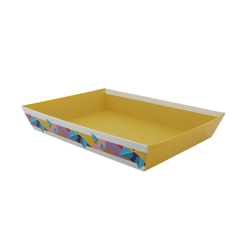 Corbeille rectangle en carton Primavera est le contenant de présentation parfait pour la confection de colis cadeau aux couleurs vives. La gamme Primavera est fabriquée en carton impression quadri avec une finition brillante. Exemple de capacité de contenance : 2 bouteilles 75cl + 3 terrines 9