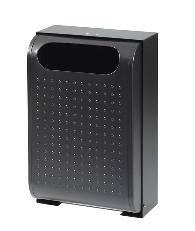 . - Acier traité anti - corrosion et poudré anti - UV. - Façade gaufrée. - Support sac intérieur. - Ouverture frontale. - Système de verrouillage discret sans clé (loquet intérieur). - Marque