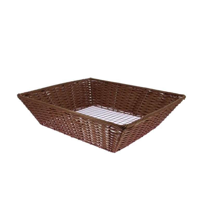 Manne en tressage plastique polypropylène avec armature et fond ajouré inox. - Lavable et résistant a l'eau. - Certification SGS contact alimentaire. - Dimension 54x46x17cm. - Cette corbeille ou manne en polypropylène marron est spécialement conçue pour une poissonnerie ou un rayon poisson