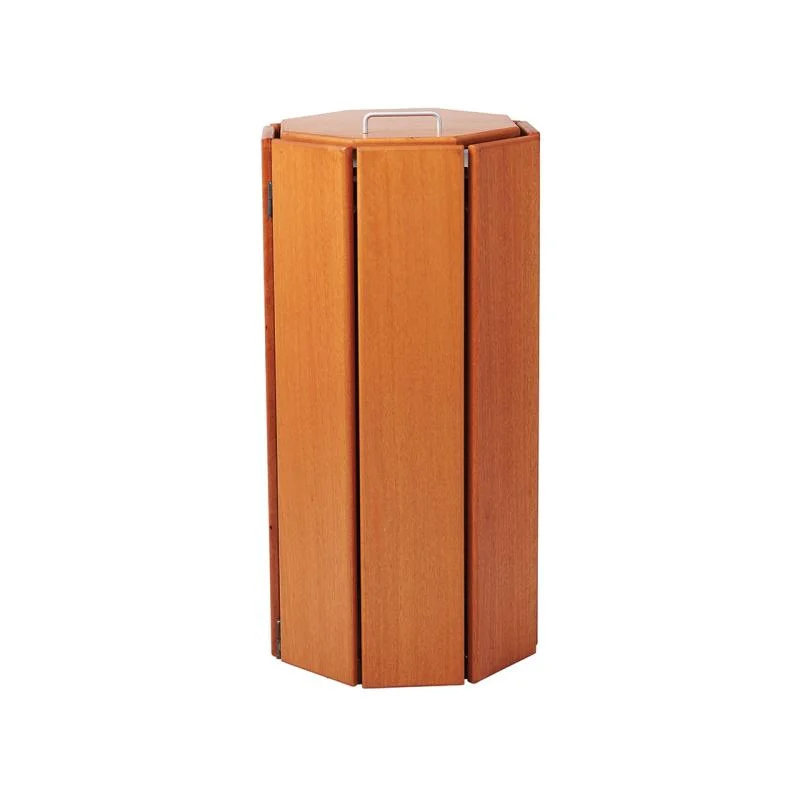 Caractéristiques techniques - Version octogonale - Corbeille en bois exotique, épaisseur 22 mm. - Bois lasuré : chêne clair ou acajou. - Dimensions : Ø 470 x hauteur 938 mm. - Poignée en aluminium. - Ouverture par l’avant. - Structure en acier galvanisé. - Fixation par tiges d’anc