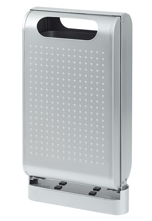 . - Acier traité anti - corrosion et poudré anti - UV. - Façade gaufrée. - Support sac intérieur. - Ouverture frontale. - Système de verrouillage discret sans clé (loquet intérieur). - Marque
