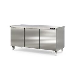 Meuble froid - Série Haut rendement - Température 0°/+8°C - 3 portes pleines - Capacité 600L - Extérieur et intérieur en inox AISI - 430 (sauf partie arrière en galva) - Porte emboutie et réversible - Charnière inox - Joint déclipsable - Roues de série (2 avec freins - 2 sans f