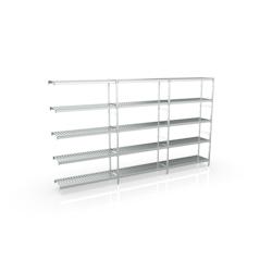 Rayonnage d'angle 3615x1970x500 5 niv - Spécialement conçu pour usage alimentaire - Structure aluminium anodisée - Clayettes en polyéthylène qualité alimentaire - Vis en acier inoxydable - Compatible à une utilisation en chambres froides, à la fois pour des températures positives comme négatives - Assemblage facile et sans outil