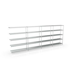 Rayonnage d'angle 5550x1970x400 5 niv - Spécialement conçu pour usage alimentaire - Structure aluminium anodisée - Clayettes en polyéthylène qualité alimentaire - Vis en acier inoxydable - Compatible à une utilisation en chambres froides, à la fois pour des températures positives comme négatives - Assemblage facile et sans outil