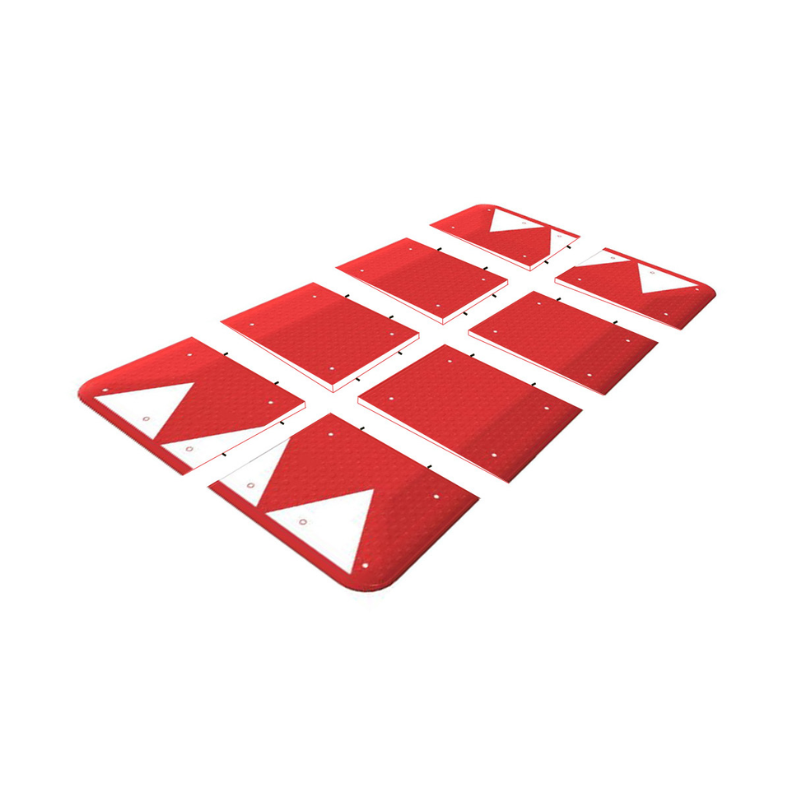 - Composé de 6 éléments en caoutchouc Vulcanisé. - Dimension totale : 3000 x 1800 mm. - Forme trapézoïdale (conseillé par le CERTU). - 6 trous pour fixation au sol par éléments soit 44 points d’ancrage. - 6 « Dents de requin ». - Bandes rétroréfléchissantes blanches, triangulair