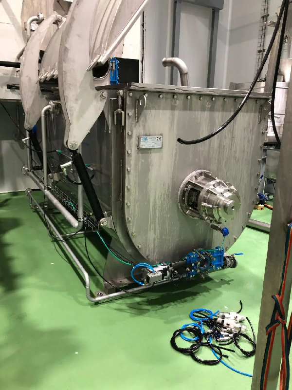 Cuve en inox 316L de Bachiller avec un demi - rond calorifugé sur toute la caisse, avec un fond klopper supérieur et inférieur avec trou d'homme de 400mm, deux oreilles de levage et 4 brides. Sortie centrale à l'étage inférieur montée sur trois pieds avec cellules de pesée. - Caractéristiq