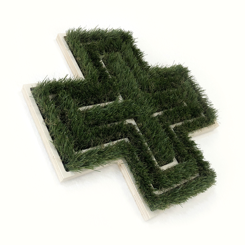 Enseigne croix de pharmacie végétale verte en mousse, lichen ou herbe synthétique.