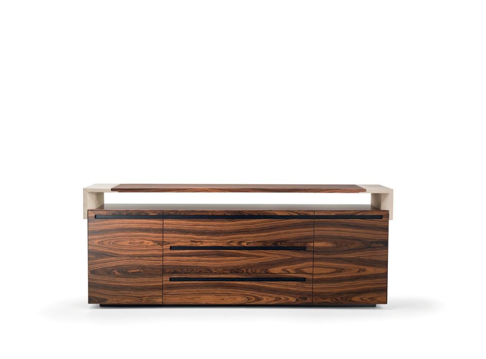 La collection de mobilier de bureau Meteora, dessinée par l'architecte Guido Faleschini suivant un projet des premières années '80, a été mise à jour et enrichie avec de nouveaux matériaux précieux. En plus du cuir et du mélaminé noir, un nouveau et prestigieux bois type ébène a été aj