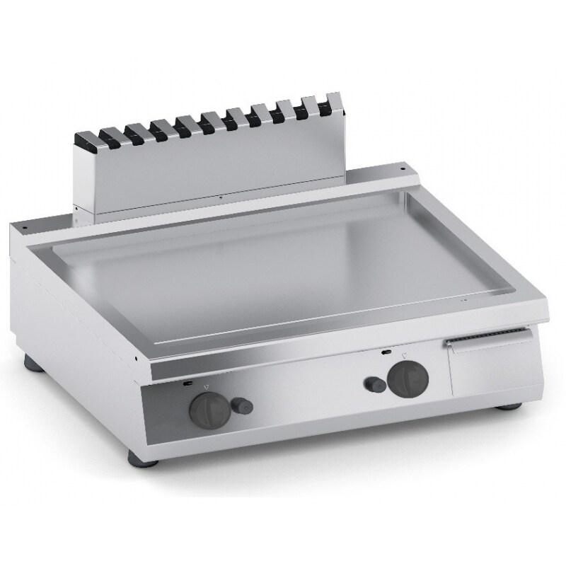 Plancha gaz professionnelle avec plaque lisse et épaisse, idéale pour une cuisson rapide et uniforme. Robuste, facile à nettoyer et compatible gaz naturel ou GPL, parfaite pour la restauration. - Structure en acier inoxydable - Poignées athermiques en plastique thermodurcissable - Brûleur ga