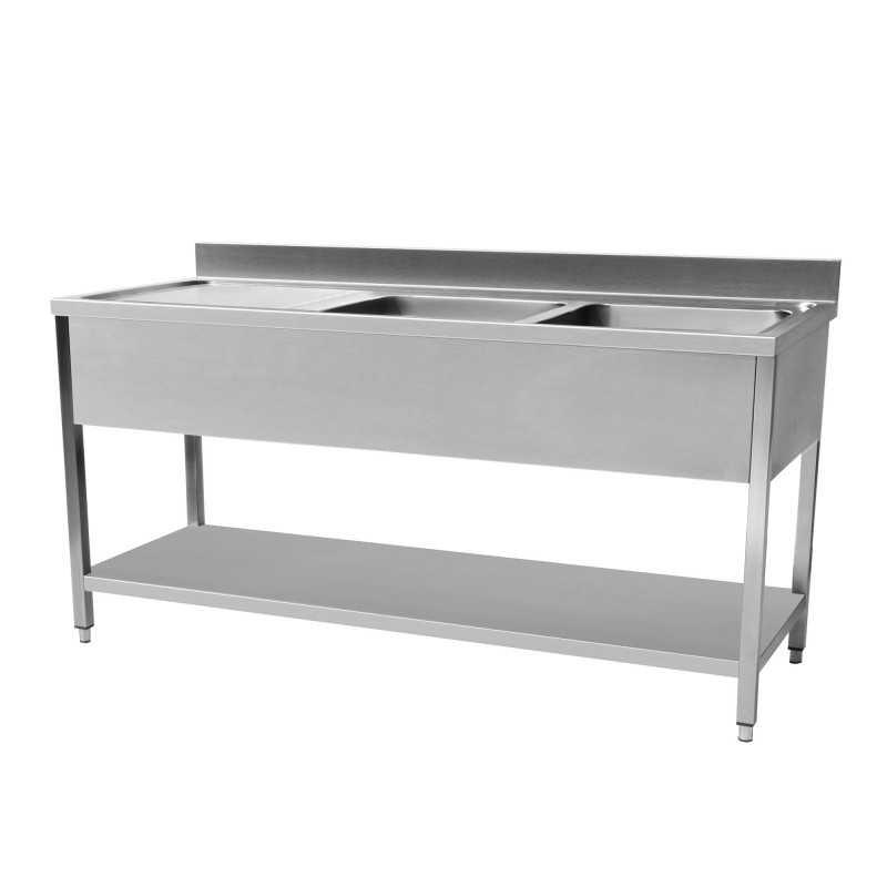 Plonge : - 2 bacs : 400x500x300 mm - 1 égouttoir à gauche - Matériau : inox - Modèle : adossée - Dimensions : 1600x700x900 mm - Équipée d'une étagère - Passage pour machine à laver -