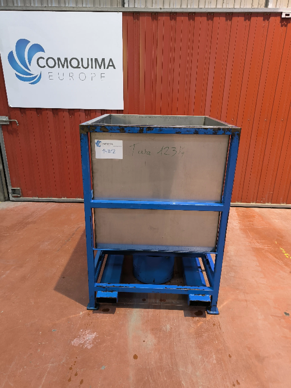 Cuve carrée en acier inoxydable de 485 litres montée sur structure métallique.