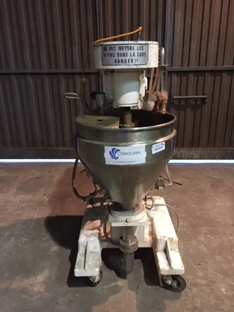 Cuve de mélange conique verticale en inox Volume total : 30 litres Fond conique Sans couvercle Circuit fermé par le système CFM installé dans la vidange Sur châssis mobile, avec double carter inox Agitations : 2 pales avec un arbre d'entraînement commun pour pcm Moteur d'entraînement" Bauknecht", 1 CV, 690 tours/min, 220/380 V Vitesse des poulies et des courroies trapézoïdales vitesse d'agitation : 230 tr/min Dimensions internes du réservoir : ø 400 mm, hauteur totale : 400 mm Dimensions extérieures approximatives : 1000 x 550 mm, hauteur 1200 mm.