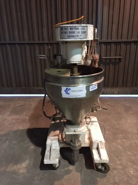 Cuve verticale en acier inoxydable d'une capacité de 100 litres. - Fond supérieur bombé vissé au corps avec 2 voyants, 3 raccords type pince et moteur d'agitation. - Fond inférieur conique avec refoulement par le bas. - Il dispose d'une pompe située sous le fond inférieur pour la recircula