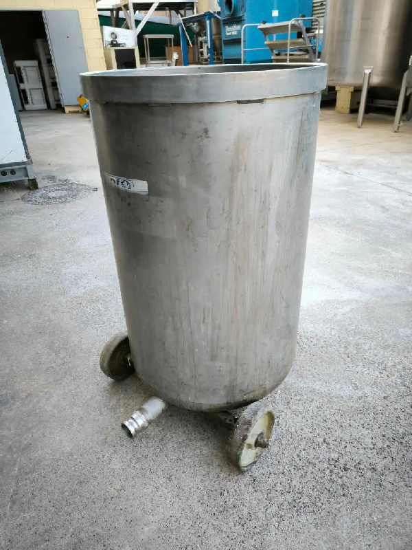 Cuve de dispersion d'occasion en acier inoxydable d'une capacité de 250 litres. Décharge par le côté avec fond incliné. Sur roues. Sans documentation.