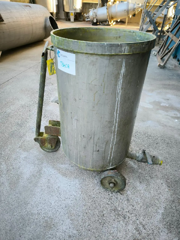 Cuve de dispersion d'occasion en acier inoxydable d'une capacité de 250 litres. Caractéristiques : - Décharge par le côté avec fond incliné - Sur roues - Sans documentation - Volume : - Capacité totale : 250 L - Matériel : - Acier inoxydable 304 - Dimensions : - Diamètre intérieur