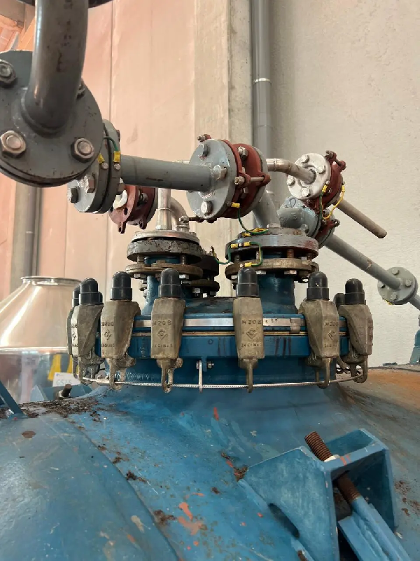 Cuve d'occasion en acier inoxydable d'une capacité de 3180 litres. Agitation centrale de type hélice. Klopper haut bas avec bouche d'homme et diverses connexions. Sur 4 pattes. Diamètre du corps : 1500 mm - Référence : C13191