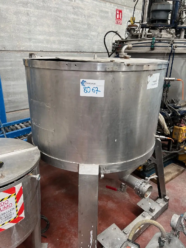 Cuve en acier inoxydable d'une capacité de 1000 litres. Fond plat avec couvercle à ouverture manuelle. Fond conique avec décharge par le bas. Sur 4 pattes.