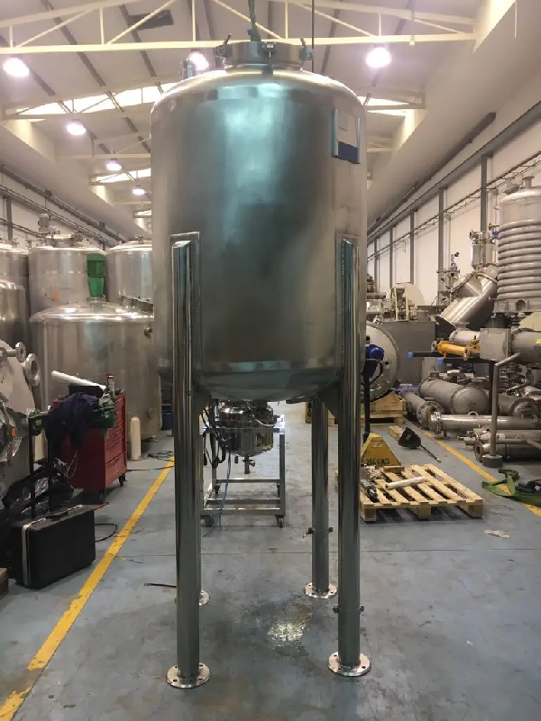 Cuve en inox 316L de Bachiller avec un demi - rond calorifugé sur toute la caisse, avec un fond klopper supérieur et inférieur avec trou d'homme de 400mm, deux oreilles de levage et 4 brides. Sortie centrale à l'étage inférieur montée sur trois pieds avec cellules de pesée. Caractéristique