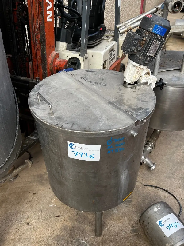 Cuve d'occasion en acier inoxydable, d'une capacité de 180 litres. Equipé d'une chemise, d'une agitation et d'une pompe mono refoulement. - Référence : C8909 SF