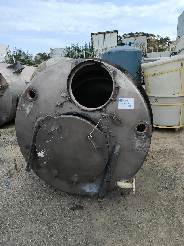 Cuve en acier inoxydable d'une capacité totale de 3 000 litres. Peut servir de cuve pour DISPERMIX Fond supérieur plat avec trou d'homme Fond klopper avec évacuation par le bas Sur bague Diamètre intérieur du corps : 1600 mm Aucune documentation