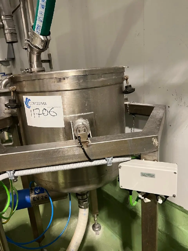 Cuve verticale en acier inoxydable d'une capacité de 1 500 litres. Fond supérieur conique avec bride. - Bride latérale en partie supérieure du corps, demi - tige en partie inférieure du corps, deux oreilles et deux tuyaux avec bride. - Fond inférieur Klopper avec évacuation par le arrière
