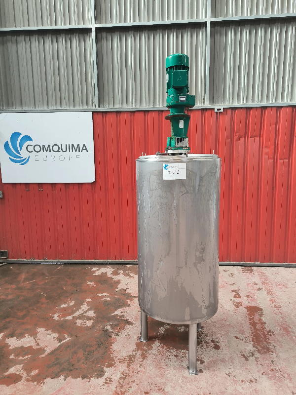 Réservoir vertical en acier inoxydable 316, d'un volume de 590 litres, avec agitation. - Fond supérieur : plat avec couvercle. - Fond Klopper : avec sortie de tube de 50 mm de diamètre. - Agitation : de type hélice tripale. - Moteur : 0,37 kW à 1400 tr/min. - Sur 3 pieds. - Volume - Capa