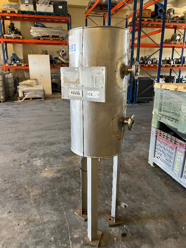 Cuve verticale en acier inoxydable d'une capacité de 650 litres. - Fond supérieur Klopper avec bride d'alimentation - Corps avec 3 brides - Fond inférieur Klopper avec bride de refoulement - Monté sur 3 pieds - Caractéristiques techniques : - Pression de conception : 7 bar - Test : 10 ba