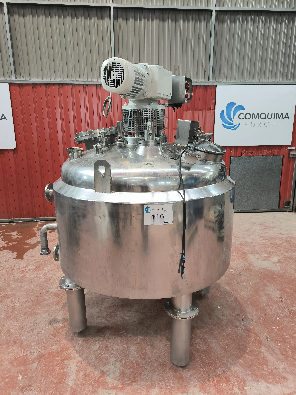 Cuve verticale en acier inoxydable de 550 litres, avec double enveloppe et agitateur type ancre avec racleurs en téflon.