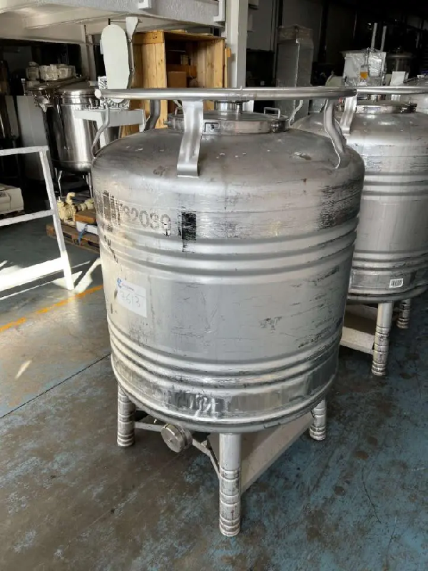 Réservoir vertical en acier inoxydable de 970 litres. Année 1992. - Fond supérieur Klopper avec DN25 et 3 raccords DN40. - Raccords latéraux DN15 - Fond Klopper avec sortie DN25 - Sur 4 pieds. - Volume - Capacité totale : 970 L - Matériel - Acier inoxydable - Caractéristiques techniq