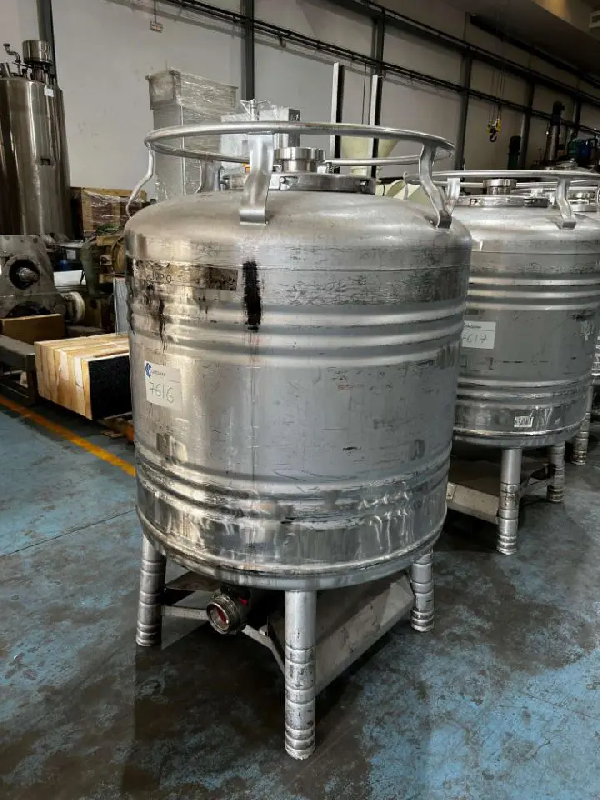 Réservoir vertical en acier inoxydable de 970 litres. Année 1992. - Fond supérieur Klopper avec DN25 et 3 raccords DN40. - Raccords latéraux DN15 - Fond Klopper avec sortie DN25 - Sur 4 pieds. - Volume - Capacité totale : 970 L - Matériel - Acier inoxydable - Caractéristiques techniq