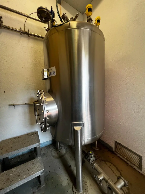 Cuve en acier inoxydable d'une capacité de 730 litres. Fond supérieur : Klopper avec soupape de pression de sécurité réglée à 6 bars. Fond inférieur : Conique avec décharge par le bas. Configuration : Sur 3 pattes. - Volume - Capacité totale : 730 L - Matériel - Acier inoxydable 316/