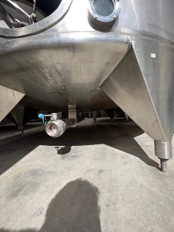 Cuve en acier inoxydable d'une capacité totale de 26 000 litres.Caractéristiques : - Fond supérieur conique avec agitation à hélice à différentes hauteurs. - Fond conique avec décharge par le bas. - Sur 5 pattes. -