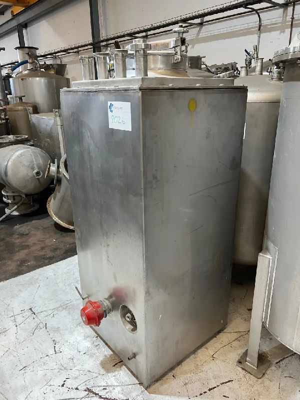 Cuve verticale carrée, en acier inoxydable, d'une capacité de 500 litres. Avec veste et bobine intérieure. Décharge par le côté.