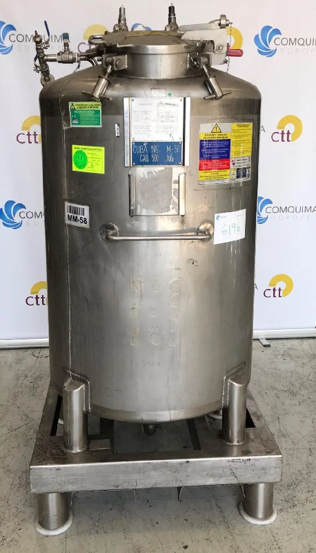 Cuve verticale en acier inoxydable d'une capacité de 650 litres. Fond supérieur Klopper avec bride d'alimentation - Corps avec 3 brides - Fond inférieur Klopper avec bride de refoulement Monté sur 3 pieds Caractéristiques techniques : Pression de conception : 7 bar test : 10 bar Température