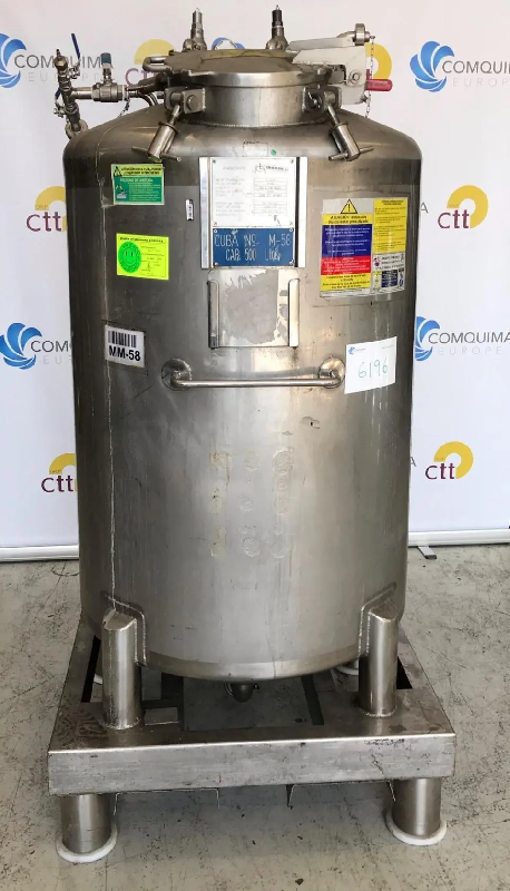 Cuve verticale en acier inoxydable d'une capacité utile de 500 litres. - Fond supérieur Klopper avec trou d'homme à ouverture manuelle avec fermetures manuelles, collecteur avec raccords filetés et raccord de chargement de type camlock - Fond inférieur conique avec vanne de décharge. - Avec
