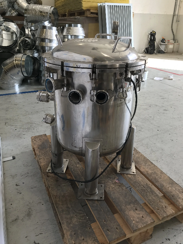 Cuve d'occasion en acier inoxydable avec une capacité de 1000 litres. - Fond supérieur : plat avec trou d'homme de diamètre 490 mm avec couvercle rabattable. - Fond inférieur : diffuseur avec décharge par le bas. - Montée sur 4 pieds. - Connexions fond supérieur : - 2 Embouts NW40 - 1 F