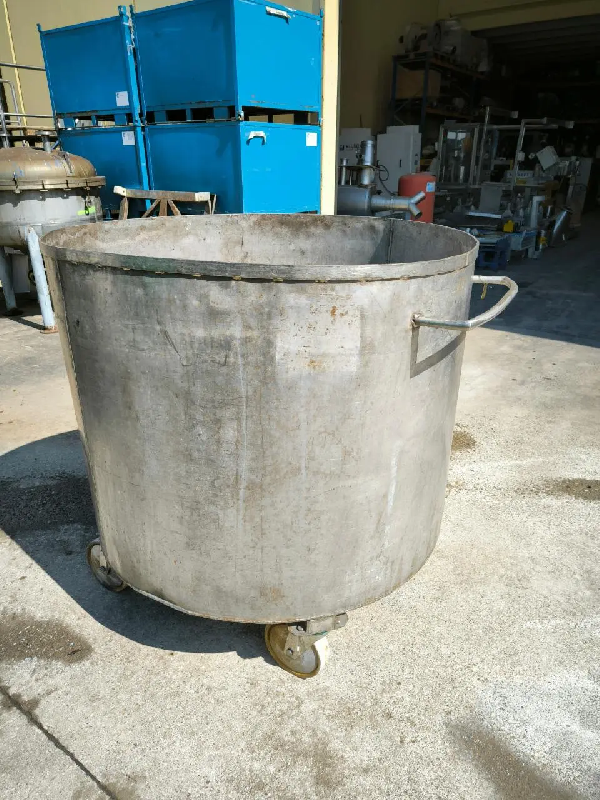Cuve d'occasion en acier inoxydable avec une capacité de 1000 litres. - Fond supérieur : plat avec trou d'homme de diamètre 490 mm avec couvercle rabattable. - Fond inférieur : diffuseur avec décharge par le bas. - Montée sur 4 pieds. - Connexions fond supérieur : - 2 Embouts NW40 - 1 F