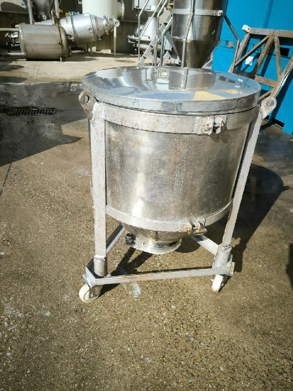 Cuve verticale en acier inoxydable d'une capacité de 150 litres. Fond supérieur convexe avec 6 raccords type clamp et 2 oreilles de levage. - Avec entrée latérale. - Fond inférieur convexe avec refoulement par le bas par vanne et agitation à hélice sans moteur. Sur 4 roues. - Référence
