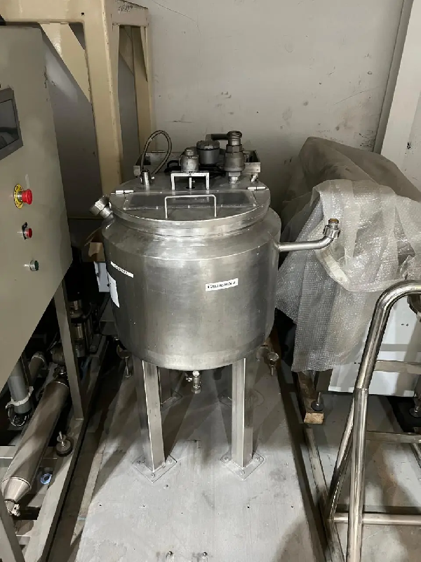 Réservoir vertical en acier inoxydable de 970 litres. Année 1992. - Fond supérieur Klopper avec DN25 et 3 raccords DN40. - Raccords latéraux DN15 - Fond Klopper avec sortie DN25 - Sur 4 pieds. - Volume - Capacité totale : 970 L - Matériel - Acier inoxydable - Caractéristiques techniq