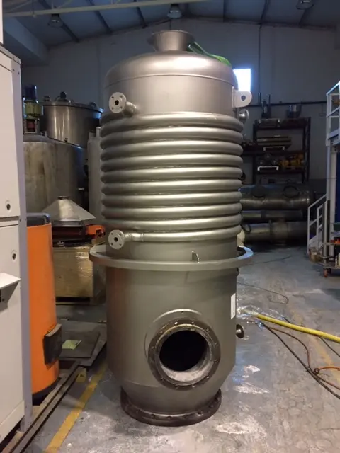 Cuve en inox 316L de Bachiller avec un demi - rond calorifugé sur toute la caisse, avec un fond klopper supérieur et inférieur avec trou d'homme de 400mm, deux oreilles de levage et 4 brides. Sortie centrale à l'étage inférieur montée sur trois pieds avec cellules de pesée. - Caractéristiq