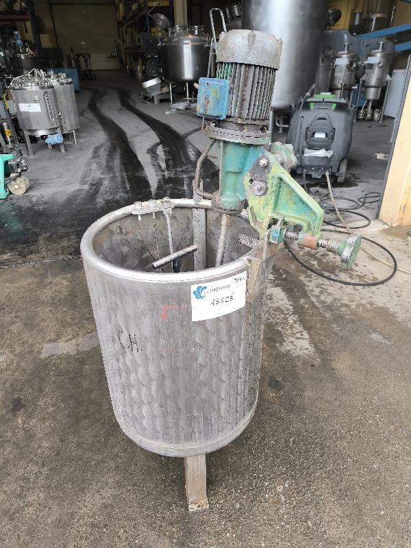 Cuve verticale en acier inoxydable 316, d'un volume de 510 litres, avec agitation. - Fond supérieur plat avec couvercle. - Fond Klopper avec sortie DN30. - Agitation de type hélice tripale. - Moteur : 037 kw à 1366 rpm. - Sur 3 pieds. - Volume - Capacité totale - 510 L - Matériel - Ac