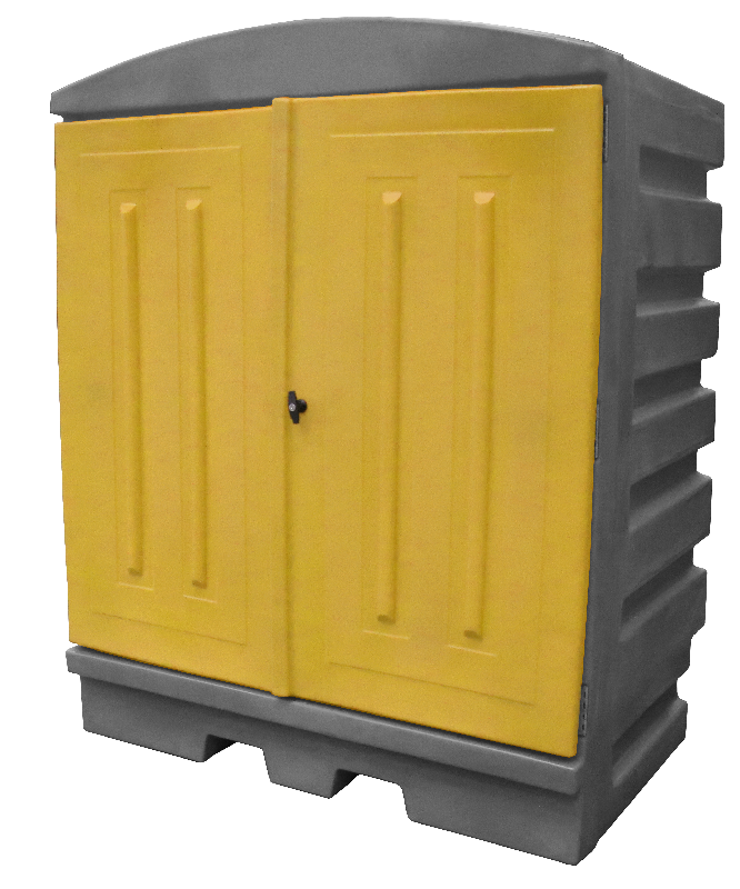 2 portes battantes sur charnières inox fermées à clé - Corps gris, portes gris jaunes ou oranges - Passage de fourche pour déplacement à vide - livrée montée. Adaptée au stockage interne ET externe des fûts de produits corrosifs. Cuve étanche aux fuites et aux ruissellements des eaux de pluie.