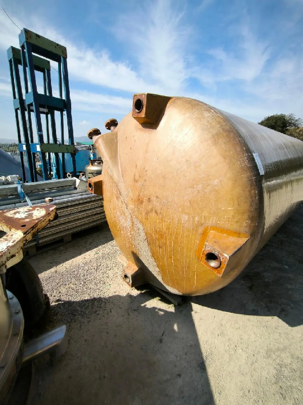 Cuve à fibres d'occasion d'une capacité de 15 500 litres. Fond inférieur Klopper avec décharge par le bas. Fond supérieur Klopper avec bouche centrale et bride. Sur 4 pattes Sans documentation.