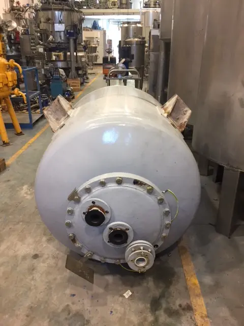 Cuve horizontale en acier inoxydable. - L'équipement a été utilisé comme récupérateur de liqueur mère centrifugeuse. Avec couvercle rabattable manuellement, pince et tube en haut et décharges à pince (1 sur chaque fond). Dimensions de transport : - Hauteur : 900 mm - Diamètre : 600 mm