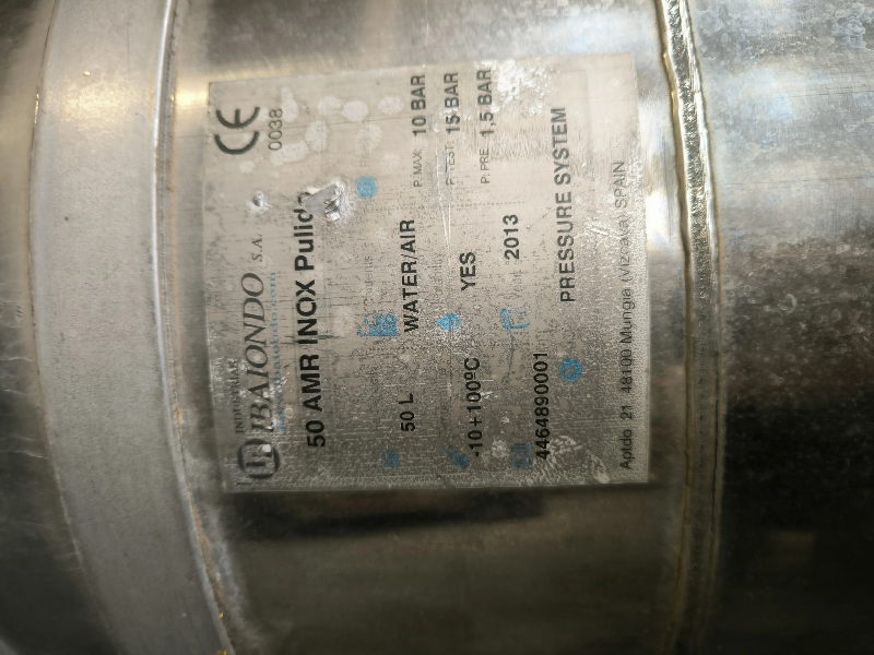 Réservoir fabriqué par IBAIONDO en acier inoxydable, modèle 50 AMR - P INOX, d'une capacité de 50 litres. - Corps - Pression maximale: 10 bar - Pression d'essai: 15 bars - Température: - 10/100°C - Capacité: 50 L - Volume - Capacité totale: 50 L - Matériel - Acier inoxydable - Ca