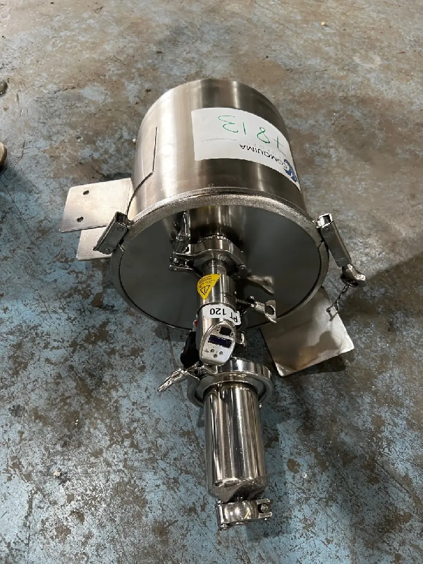 Cuve verticale en acier inoxydable d'une capacité de 100 litres. - Fond supérieur bombé vissé au corps avec 2 voyants, 3 raccords type pince et moteur d'agitation. - Fond inférieur conique avec refoulement par le bas. - Il dispose d'une pompe située sous le fond inférieur pour la recircula