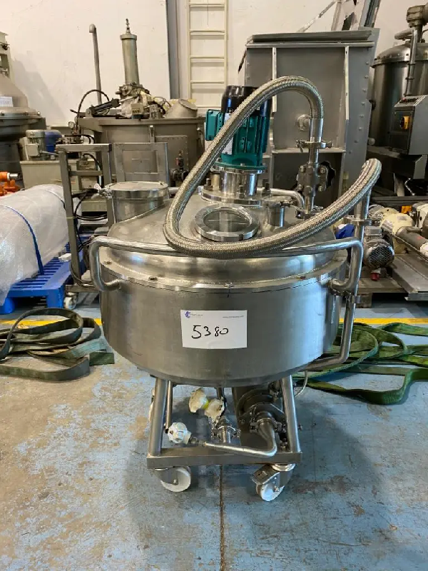 Cuve verticale en acier inoxydable d'une capacité de 100 litres. Fond supérieur bombé vissé au corps avec 2 voyants, 3 raccords type pince et moteur d'agitation.