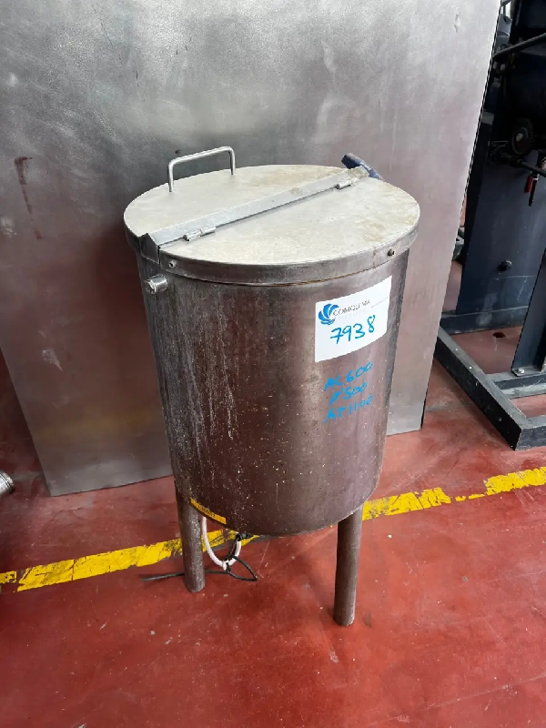 Cuve en acier inoxydable d'une capacité de 120 litres. Fond plat avec couvercle à charnière. Fond conique avec décharge par le bas. Sur 3 pattes.
